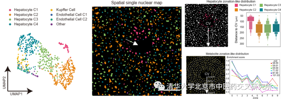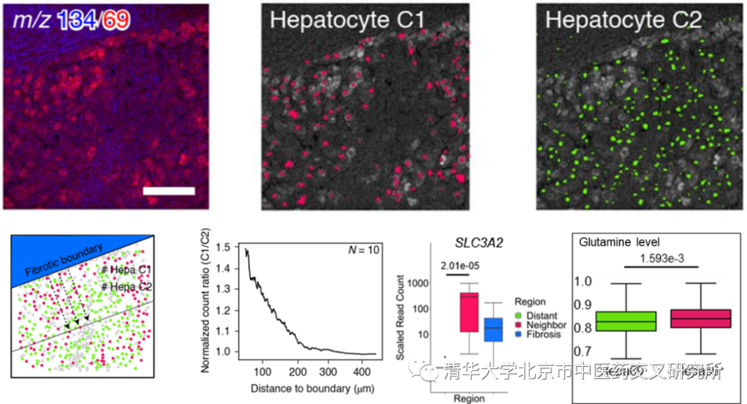 为了验证新方法,清华大学张奇伟、张新荣团队解析了野生型小鼠肝脏组织中的空间代谢异质性,发现了肝细胞代谢异质性亚群。这一发现和前人通过蛋白或者基因表达所验证的肝组织分区现象(Liverzonation)有着高度一致(图2),有效证明了SEAM方法的可靠性和准确性。