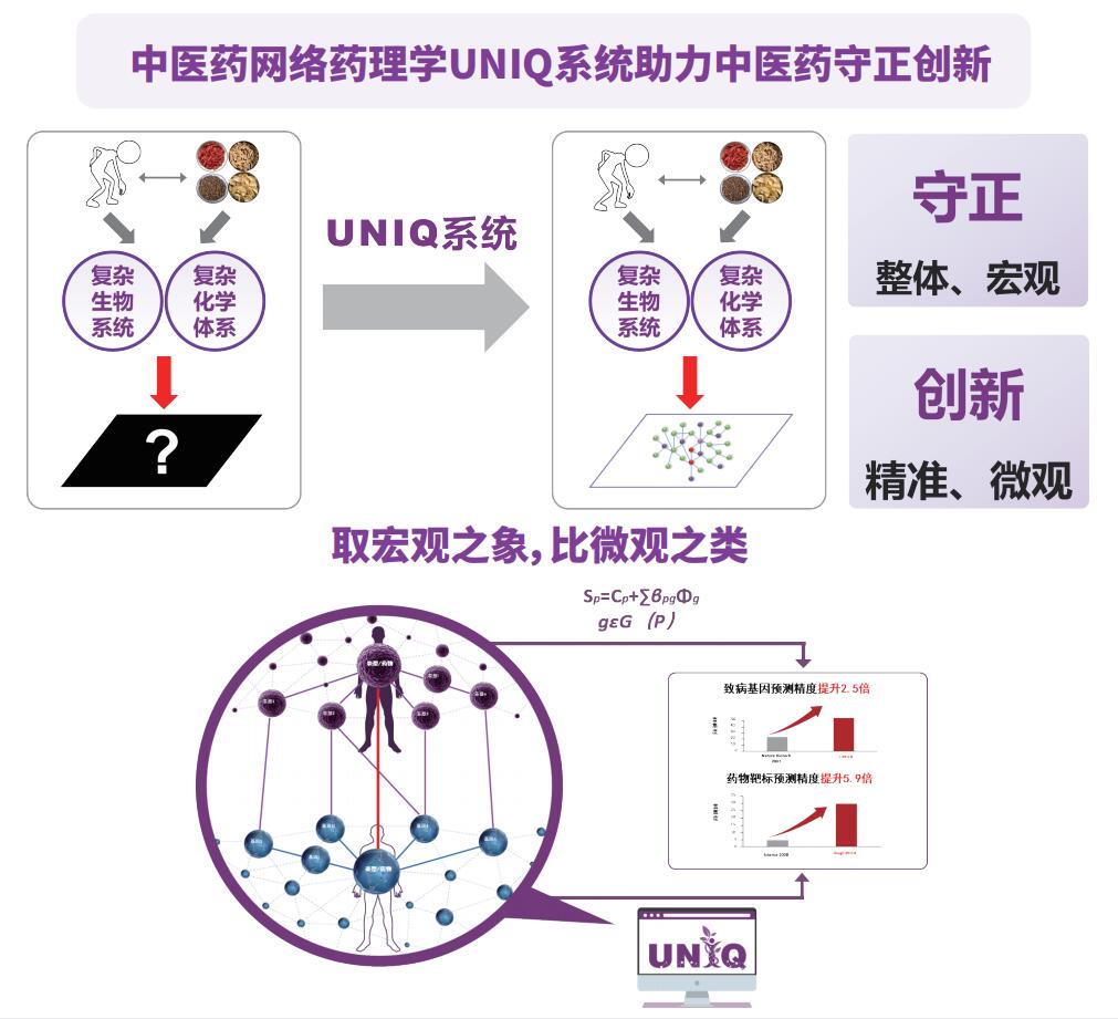 融合人工智能、生物信息、大数据等技术,提出“网络靶标” 理论,创 建网络药理学关键技术平台UNIQ系统,揭示中医药相关复杂生命网络 的系统构成原理和调节机制,以现代科学解读中医药,推动中医药守正 创新。