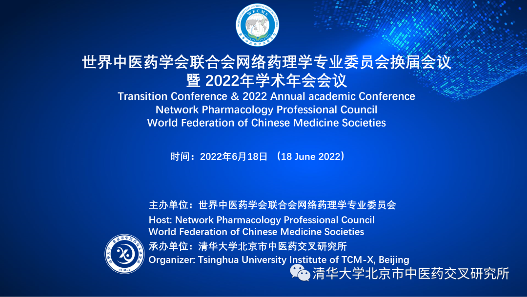 2022年6月18日,以“中医药网络药理学守正创新发展”为主题的世界中医药学会联合会网络药理学专业委员会换届大会暨2022年网络药理学学术年会召开。本次会议采用网络会议形式,由世界中医药学会联合会网络药理学专业委员会主办,清华大学北京市中医药交叉研究所承办。